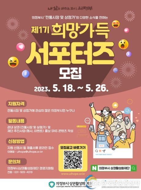 의정부시상권활성화재단은 관내 상권 활성화를 위한 다양한 홍보 콘텐츠 제작 및 SNS 콘텐츠 확산을 통해 소비자와 소상공인의 소통을 강화하고자‘희망가득 서포터즈’를 오는 5월 18일부터 26일까지 모집한다.