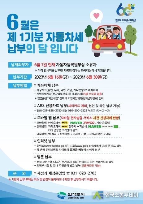 한국소통투데이 관리자 기자 | 의정부시는 2023년 6월 제1기분 자동차세 11만4천355건, 117억 원을 부과하고 고지서를 납세자에게 일제히 송부한다고 14일 밝혔다.