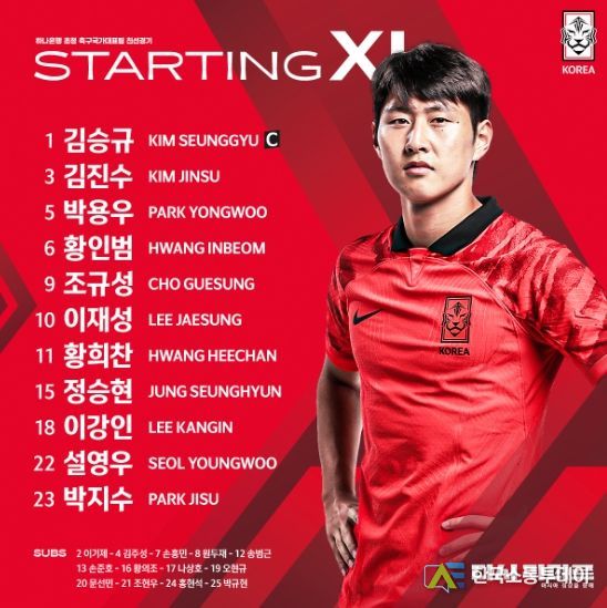 지난 경기에서 4-4-2 포메이션을 실험했던 클린스만 감독은 3월 A매치 2연전에서 활용했던 4-2-3-1 포메이션을 다시 꺼내들었다. 최전방 공격수로 조규성이 나서며 왼쪽 날개는 이강인, 오른쪽 날개는 황희찬이 맡는다.