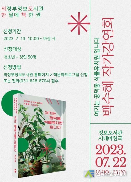 한국소통투데이 관리자 기자 | 의정부정보도서관은 7월의 의도한 책(의정부정보도서관 한 달에 책 한 권)으로 「여기는 ‘공덕동 식물유치원’입니다」와 「프랑켄 수선집」을 선정하고 작가 강연회를 개최한다.