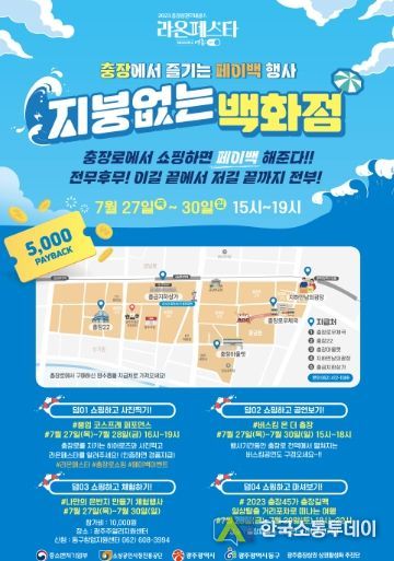 행사 기간 내내 우체국·충장22·충장아울렛·만남의 광장·충금 지하상가 등 5개소에서는 구매영수증을 가져오면 즉석 쿠폰(5천 원 상당)을 지급하는 ‘페이백’ 이벤트가 진행된다.