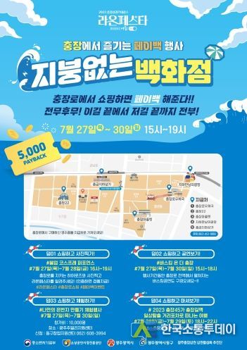 행사 기간 내내 우체국·충장22·충장아울렛·만남의 광장·충금 지하상가 등 5개소에서는 구매영수증을 가져오면 즉석 쿠폰(5천 원 상당)을 지급하는 ‘페이백’ 이벤트가 진행된다.