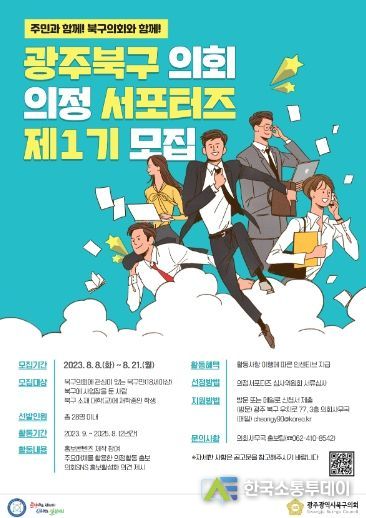 한국소통투데이 관리자 기자 | 광주 북구의회는 오는 21일까지 의정활동에 관심 있는 주민들을 대상으로 북구의회 홍보의 견인차 역할을 수행할 ‘북구의회 의정서포터즈’ 를 공개모집 한다고 밝혔다.