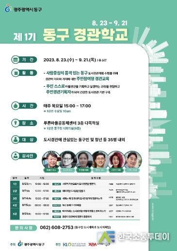 한국소통투데이 관리자 기자 | 광주 동구는 오는 23일 구청 6층 대회의실에서 주민이 함께 만들어가는 도시경관 조성을 위한 ‘제1기 경관학교’를 개강한다고 밝혔다.