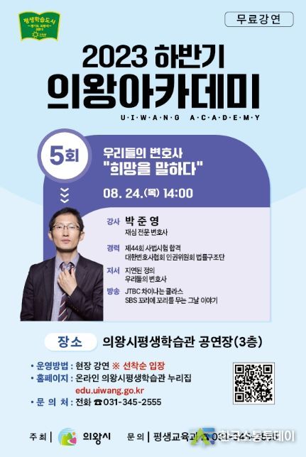 한국소통투데이 관리자 기자 | 의왕시가 오는 8월 24일 오후 2시 의왕시평생학습관에서 ‘2023년 제5회 의왕아카데미’강연을 개최한다고 밝혔다.