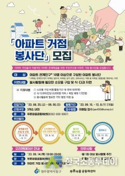 한국소통투데이 관리자 기자 | 광주 동구는 아파트 입주민들이 일상에서 겪는 애로사항을 주도적으로 해결할 수 있도록 지원하는 ‘아파트 거점 봉사단’에 참여할 공동체를 9월 5일까지 모집한다고 밝혔다.