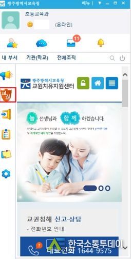 한국소통투데이 관리자 기자 | 광주시교육청이 교사의 교육활동을 보호하고 이를 지원하기 위해 ‘교직원 소통 메신저(GEN)’에 ‘교권’ 창구를 개설하고 방패 모양의 바로가기 아이콘을 배치했다.