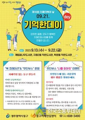 한국소통투데이 관리자 기자 | 광주 동구는 오는 22일까지 제16회 치매극복의 날(9월 21일)을 맞이해 따뜻한 동행 모두가 행복한 치매 친화 사회 구현을 위한 ‘우리모두 기억한데이’ 행사를 진행한다고 밝혔다.