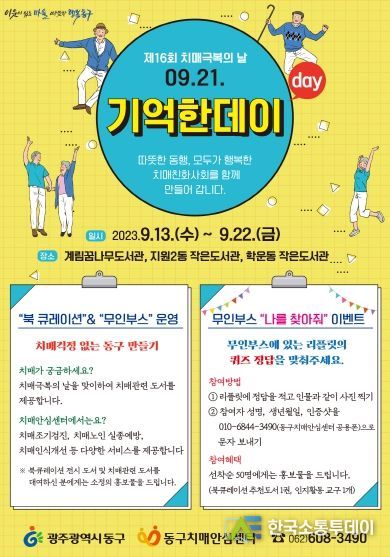 한국소통투데이 관리자 기자 | 광주 동구는 오는 22일까지 제16회 치매극복의 날(9월 21일)을 맞이해 따뜻한 동행 모두가 행복한 치매 친화 사회 구현을 위한 ‘우리모두 기억한데이’ 행사를 진행한다고 밝혔다.