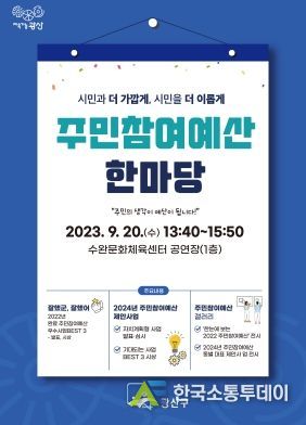 한국소통투데이 관리자 기자 | 광주 광산구가 ‘시민과 더 가깝게, 시민을 더 이롭게’를 구호로 2023 광산구 주민참여예산 한마당 행사를 20일 수완문화체육센터에서 개최한다.