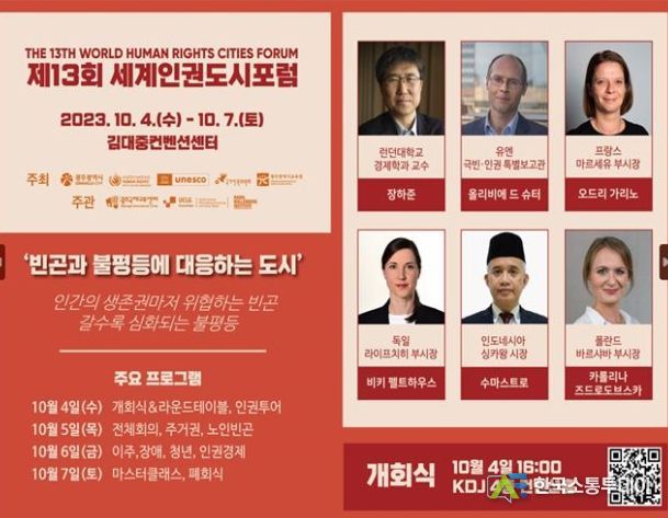 광주광역시는 유엔 인권최고대표사무소, 유네스코, 국가인권위원회, 광주시교육청과 공동으로 오는 10월 4일부터 7일까지 김대중컨벤션센터에서 ‘제13회 세계 인권도시포럼’(이하 광주포럼)을 개최한다.