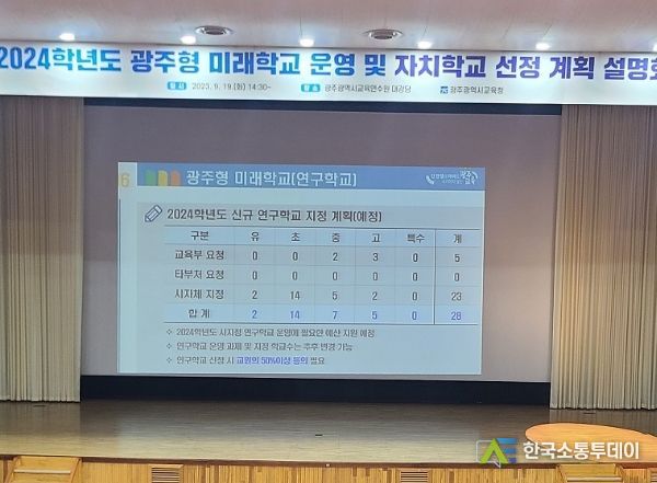 한국소통투데이 관리자 기자 | 광주시교육청이 지난 19일 관내 학교 대상으로 ‘2024학년도 광주형 미래학교 운영 및 자치학교 선정 계획 설명회’을 개최했다고 밝혔다.