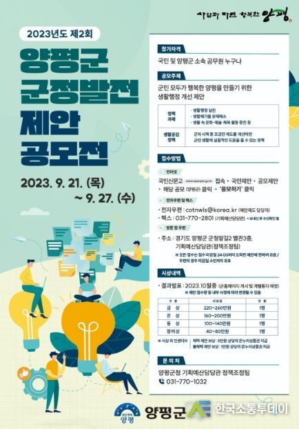 한국소통투데이 관리자 기자 | 양평군은 창의적인 정책제안 발굴과 주민과 소통하는 열린행정을 위해 9월 21일부터 27일까지 일주일간 ‘2023년 제2회 군정발전 제안 공모전’을 개최한다고 밝혔다.