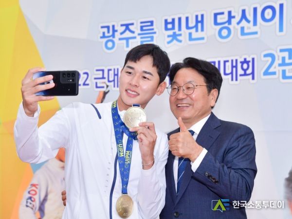 강기정 광주광역시장이 ‘항저우 아시안게임’ 한국 첫 2관왕 근대5종에서 개인․단체전 금메달을 획득한 전웅태 선수(28·광주광역시청)에게 축하 메시지를 전했다.