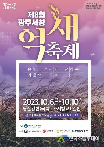 한국소통투데이 관리자 기자 | 광주를 대표하는 가을축제인 ‘제8회 광주서창억새축제’가 내달 6일 개막한다. 광주광역시 서구는 ‘은빛 억새가 전하는 가을의 약속’을 주제로 10월6일부터 10일까지 5일간 영산강변(극락교~서창교) 일대에서 서창억새축제를 개최한다고 밝혔다.