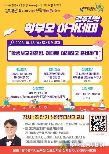 한국소통투데이 관리자 기자 | 광주시교육청이 오는 13일 19시, 광주교육연구정보원 1층 대강당에서 ‘학생부교과전형, 제대로 이해하고 준비하기’를 주제로 제5차 광주진학 학부모 아카데미를 개최한다.