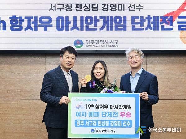 한국소통투데이 관리자 기자 | 대한민국을 대표하는 펜싱 선수이자 광주 서구의 얼굴인 강영미 선수가 금의환향했다. 광주광역시 서구(구청장 김이강)는 10일 오후 제19회 항저우아시안게임 펜싱 여자 에페 단체전에서 금메달을 딴 강영미 선수를 초청해 축하 자리를 가졌다.