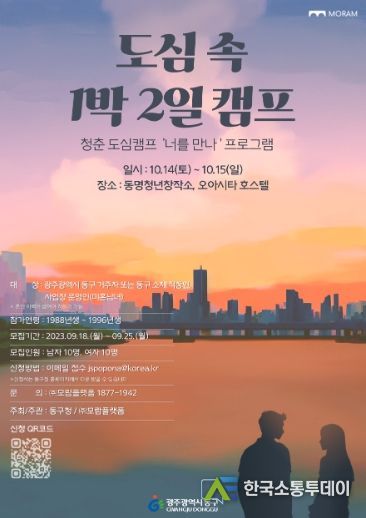 한국소통투데이 관리자 기자 | 광주 동구는 오는 14~15일 양일간 미혼 남녀가 짝을 이뤄 진행하는 ‘청춘 도심 캠프! 너를 만나’ 프로그램이 입소문을 타며 대박을 예고하고 있다고 밝혔다.
