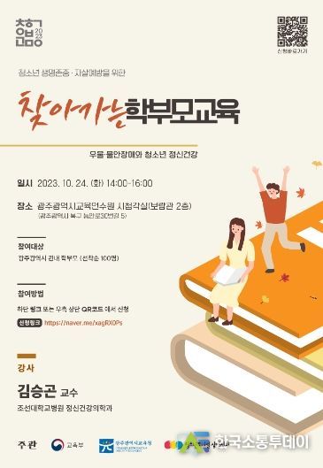 한국소통투데이 관리자 기자 | 광주시교육청이 오는 24일 광주교육연수원 시청각실에서 관내 학부모 대상으로 ‘청소년 생명존중·자살예방을 위한 학부모 교육’을 실시한다.