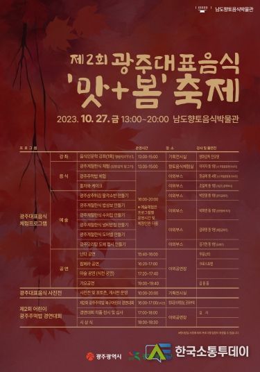 올해로 2회째를 맞은 이번 행사는 남도향토음식박물관 일원에서 열리며 이주여성, 학생 등 지역주민 1천500여 명이 참여한 가운데 광주대표음식 체험 프로그램, 광주대표음식 사진전, 광주대표음식 경연대회 등이 진행될 예정이다.