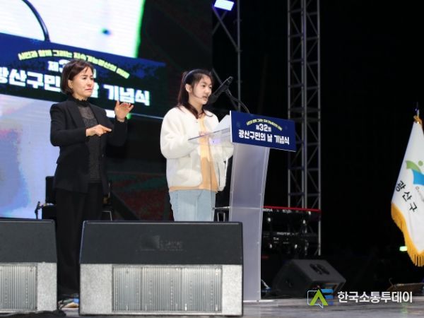 “광산구가 어떤 모습이면 좋을지”를 고민했다는 김하윤 양은 학생 대표로 친구들의 목소리를 귀 기울여 듣고, 반 전체의 공동 노력을 위해 애썼던 경험을 이야기하며 “더 나은 변화는 나 하나가 아닌 우리 모두 함께 노력해야 얻을 수 있다”며 “그것이 옳은 방향으로 발전하는 함께 사는 세상으로 나아가는 길이다. 그 길에 앞장 서는 광산구가 되길 바란다”고 말했다.