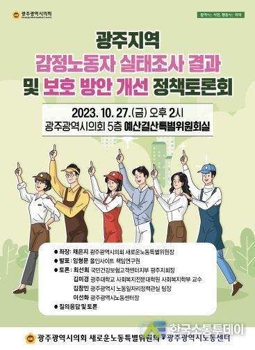 한국소통투데이 관리자 기자 | 광주광역시의회 새로운노동특별위원회와 광주노동센터는 27일 오후 2시 시의회 예산결산특별위원회실에서 ‘광주지역 감정노동자 실태조사 결과 및 보호 방안 개선’에 대한 토론회를 개최한다.