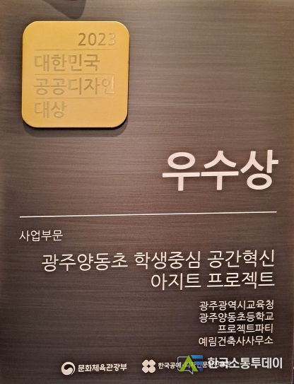 한국소통투데이 관리자 기자 | 광주시교육청이 지난 27일 서울 언더스탠드에비뉴에서 열린 ‘2023 대한민국 공공디자인 대상’ 시상식에서 ‘2022 학생중심 공간혁신 아지트 광주양동초 공간조성사업’으로 우수상을 수상했다.