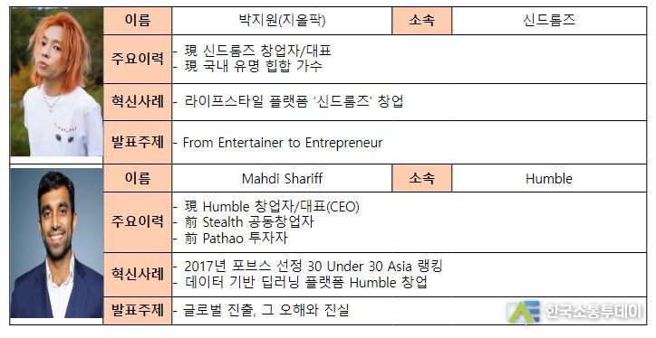 유튜브 조회수 천만, 광고, 방송 등 상반기 가장 주목받는 뮤지션 중 한명이며 생활양식(라이프스타일) 플랫폼 ‘신드롬즈’를 창업한 지올팍을 첫 번째 연사로, 자료(데이터) 기반 딥러닝 플랫폼 험블(Humble)을 창업한 Mahdi Shariff 등 약 60명의 국내·외 패널(연사)이 참여하여 국내외 창업기업(스타트업)들의 생생한 이야기를 전한다.