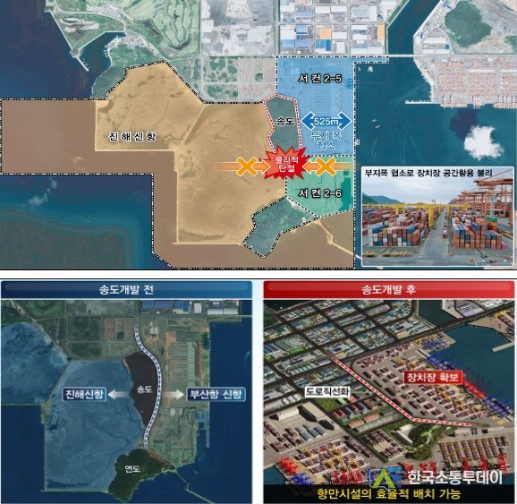 2026년에 개장할 예정인 부산항 신항 서컨테이너 터미널은 배후의 송도(섬)로 인해 컨테이너부두의 표준규모(폭 600m)에 미치지 못하는 525m의 터미널 폭만 확보할 수 있는 상황이었으며, 이는 부산항 신항의 경쟁력 저하 요인으로 지적되어 왔다.