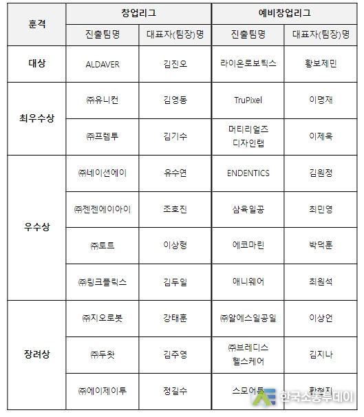 업력 3년 이내의 창업기업을 대상으로 하는 창업리그의 왕중왕(상금 3억원, 대통령상)은 ‘알데바(ALDAVER)’이, 예비창업자를 대상으로 하는 예비창업대전(리그)의 왕중왕(상금 1.5억원, 국무총리상)은 ‘라이온로보틱스’가 수상했다.