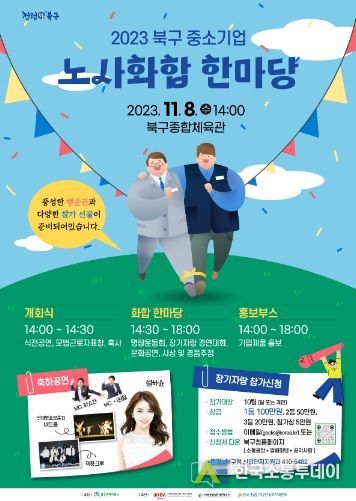한국소통투데이 관리자 기자 | 광주시 북구가 오는 8일 한국산업단지공단 광주지역본부, 첨단산업단지경영자협의회, 본촌산업단지관리공단과 함께 ‘중소기업 노사 화합 한마당’ 행사를 연다고 1일 밝혔다.
