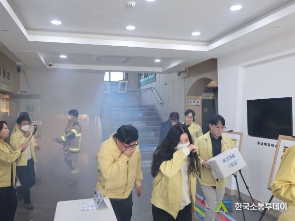 이날 훈련은 훈련시간을 미리 고지하지 않고 화재지점을 즉석에서 설정하고 현장감 넘치게 실제 재난상황에 맞는 훈련으로 진행됐다. 또한, 대피 후 청사 본관 야외에서 직원들이 직접 소화기로 화재진압을 실시해봄으로써 화재 상황에 대한 대처법을 익히는 시간도 가졌다