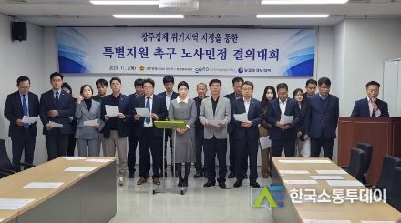 2일(목) 광주광역시의회 1층 시민소통실에서 열린 ‘광주경제 위기지역 지정을 통한 특별지원 촉구 노사민정 결의대회’에서는 대유위니아그룹 계열사 경영 위기로 촉발된 고용위기 해결을 위해 ‘고용위기지역 지정’과 협력업체의 체계적인 지원을 위한 ‘중소기업 특별지원지역’ 및 ‘산업위기대응특별지역’ 지정을 호소했다.
