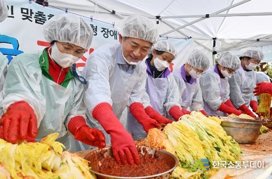 한국소통투데이 관리자 기자 | 광주광역시 서구가 ‘제30회 광주김치축제’ 현장에서 장애인들과 특별한 행사를 진행했다. 김이강 서구청장은 3일 오전 김치축제 개막식에 참석한 후 ‘서구형 장애인 일자리 사업’에 참여하고 있는 중증장애인 근로자 15명, 서구새마을부녀회 자원봉사자들과 함께 김장김치 200포기를 담가 어려운 이웃들에게 전달했다.