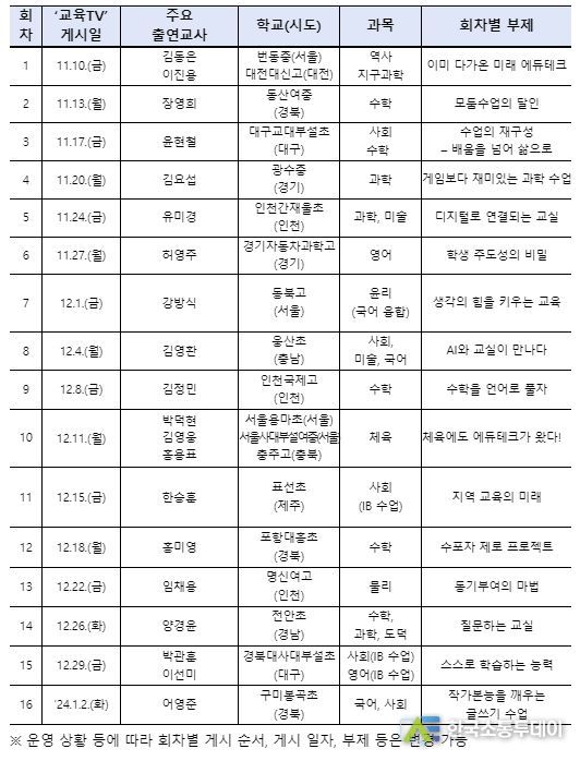아울러, 총 16회가 방영되는 동안 수업 개선을 위한 선생님들의 다양한 노력과 함께 교사와 학생이 교육공동체로서 함께 성장하는 모습을 소개할 계획이다.