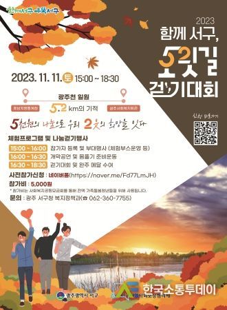 한국소통투데이 관리자 기자 | 광주광역시 서구는 주민의 관심과 ‘발걸음’으로 가족돌봄청년에게 희망을 주고 행복한 삶을 지원하기 위해 ‘함께 서구, 오~! 잇길 걷기대회’를 오는 11일 오후 3시 광주천 일대에서 개최한다.