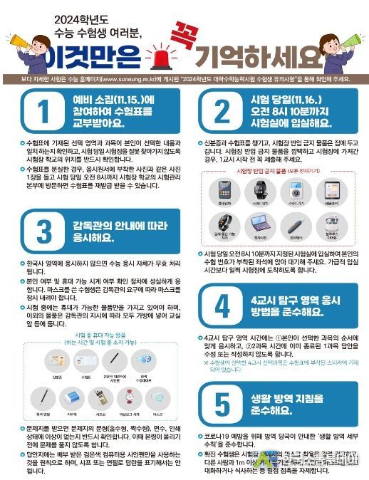 수험생은 수험표를 수령하고, 시험 유의 사항 등 각종 안내 사항을 전달받아야 하므로 시험 전날(11.15.(수)) 실시되는 예비 소집에 반드시 참석해야 한다.