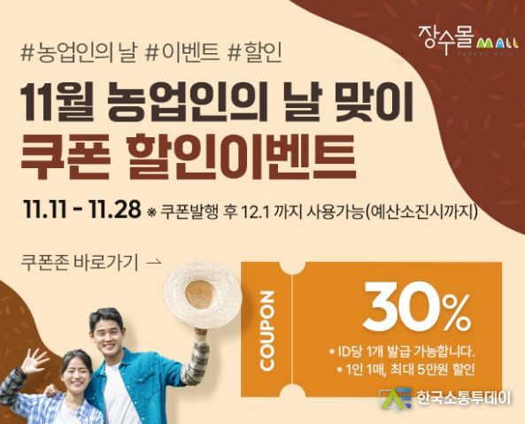 한국소통투데이 관리자 기자 | 장수군이 장수군 직영 온라인 쇼핑몰인 장수몰에서 농업인의 날을 기념해 오는 11월 11일부터 한 달간 전 품목 30% 할인 행사를 진행한다.