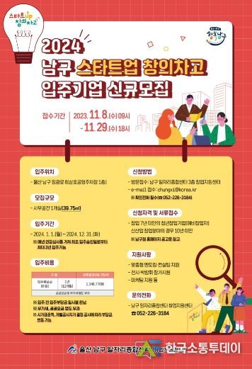한국소통투데이 관리자 기자 | 울산 남구는 지속적인 혁신과 우수한 아이디어를 가진 청년기업을 육성하기 위해 ‘2024년 남구 일자리종합센터 스타트업 창의차고’ 입주기업을 신규 모집한다고 9일 밝혔다.