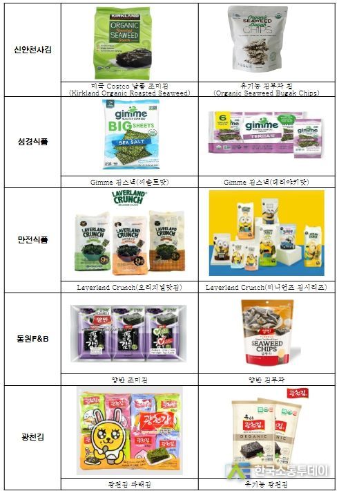 과거에는 김이 밥 반찬 등으로 주로 소비됐으나, 최근에는 해외에서 저칼로리 건강식품으로 인기를 끌면서 세계 김 시장이 급성장하고 있다. 이러한 흐름에 따라, 우리 김 산업계에서는 바비큐‧치즈‧불고기맛 스낵김을 개발하고 한식 세계화에 걸맞게 삼겹살에 싸먹는 김을 출시하는 등 끊임없는 제품 개발을 통해 세계인의 입맛을 사로잡고 있다.