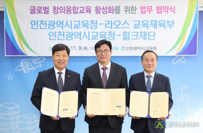 한국소통투데이 관리자 기자 | 인천광역시교육청은 글로벌 창의융합교육활성화를 위해 라오스 교육체육부, 헐크파운데이션과 업무협약을 맺었다고 14일 밝혔다. 9일 시교육청 교육감실에서 열린 협약식에는 도성훈 교육감과 이만수 헐크파운데이션 이사장, 이승복 교육이음센터장이 참석했다.