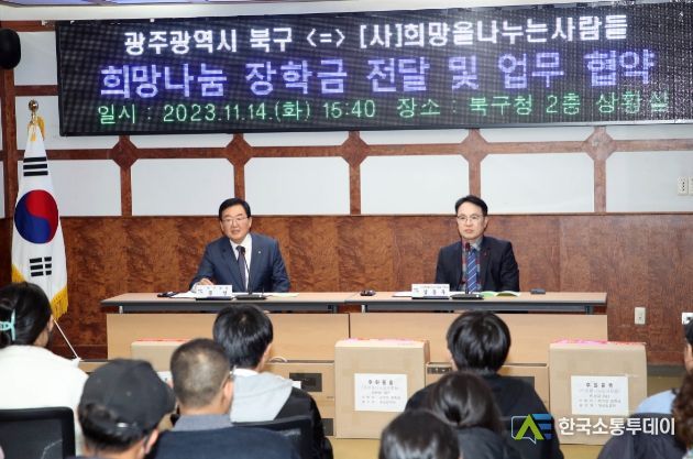 15일 북구에 따르면 지난 14일 북구청 상황실에서 문인 북구청장, 김동우 희망을나누는사람들 부회장 등 관계자들이 참여한 가운데 ‘희망 나눔 장학금 후원을 위한 업무협약’이 체결됐다.
