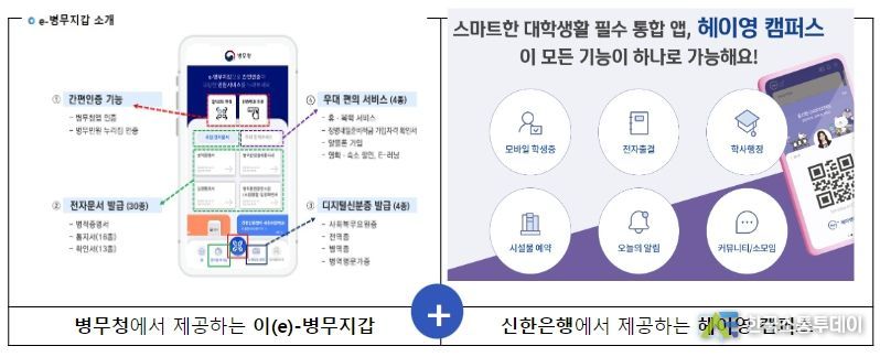 이번 협약으로 병무청 “이(e)-병무지갑”과 신한은행 “헤이영 캠퍼스”를 연계하여 병역의무자들에게 더욱 편리한 서비스를 제공하고 병역명문가를 위한 금융상품 우대혜택 등을 지원할 예정이다.