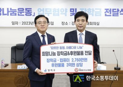 진교훈 강서구청장은 15일 오후 5시 구청 대회의실에서 김정안 (사)희망을나누는사람들 회장과 ‘소외계층 아동 및 청소년 지원을 위한 업무협약식’을 체결했다.