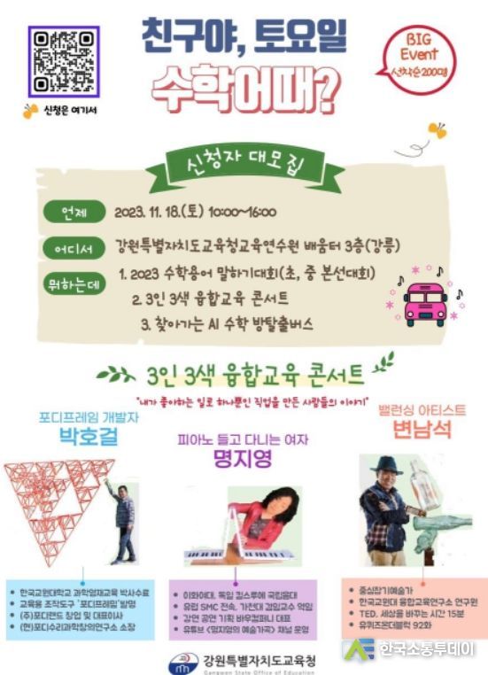 3인 3색 융합교육 콘서트는 △수학교구 포디프레임을 개발한 포디수리과학창의연구소 박호걸 소장 △피아노를 들고 다니는 바우컴퍼니 명지영 대표 △중심잡기 예술가인 변남석 밸런싱 아티스트가 출현해 ‘내가 좋아하는 일로 하나뿐인 직업을 만든 사람들의 이야기’를 들려준다.