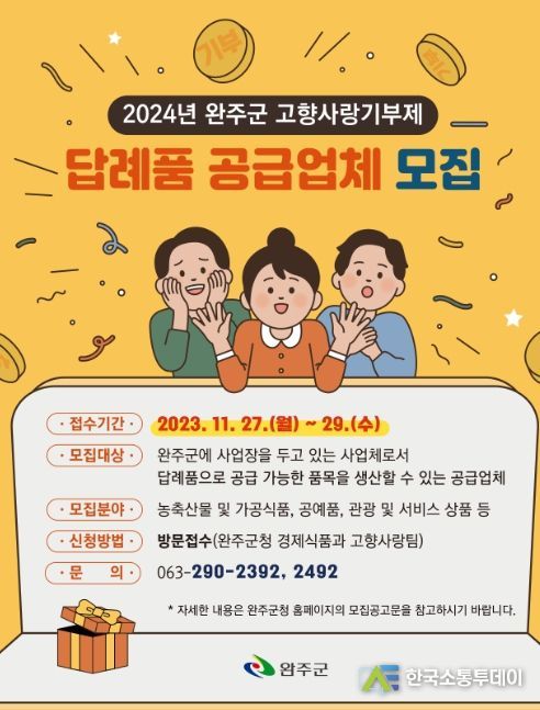 한국소통투데이 관리자 기자 | 완주군이 2024년 고향사랑기부제 답례품 및 공급업체를 모집한다.