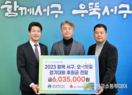 한국소통투데이 관리자 기자 | 광주광역시 서구가 지난 11일 광주천 일대에서 진행한 ‘함께 서구, 오~! 잇길 걷기대회’의 모금액 600여 만원을 가족돌봄청년의 행복한 삶을 지원하기 위해 사회복지공동모금회에 전달했다. 서구는 ‘오(5)천원’을 지역 내 소외된 ‘이(2)웃’에게 기부하는 나눔행사인 걷기대회를 개최해 주민 1000여 명이 마음을 보탰다.