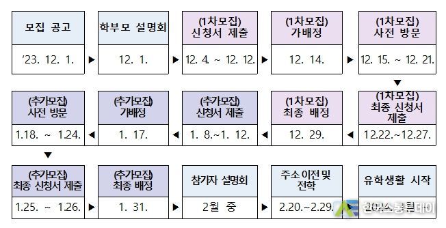 2024학년도 1학기 농촌유학을 희망하는 학생(학부모)는 12월 11일 12시까지 재학중인 학교로 신청서를 제출하면 된다. 12월 14일 전남/전북/강원 교육청 홈페이지에서 가배정 결과를 확인하여, 사전 방문(12.15. ~ 12. 21.) 후 최종 신청서 제출(12.22.~12.26.) 절차를 거쳐 12월 29일 대상자가 최종 확정된다.