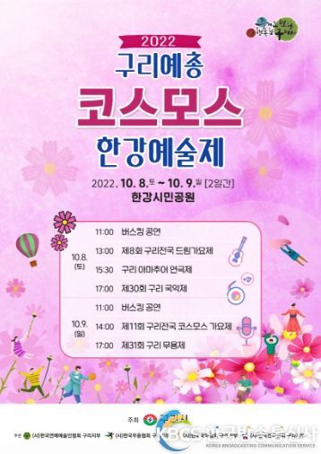 한국방송통신사 관리자 기자 | 구리시는 8일~9일 2일간 구리한강시민공원에서 공원을 방문하는 많은 방문객에게 볼거리를 제공하기 위해 가요제, 무용제, 국악제, 연극제 등 2022년 구리예총 코스모스 한강예술제를 개최한다.