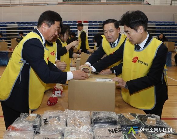 도교육청은 수혜 학생들이 선호하는 플리스 재킷과 실생활에 도움이 되는 크로스백 등의 생활용품을 선물로 준비해 이날 김대중 교육감을 비롯한 간부들이 참석한 가운데 정성들여 포장했다.